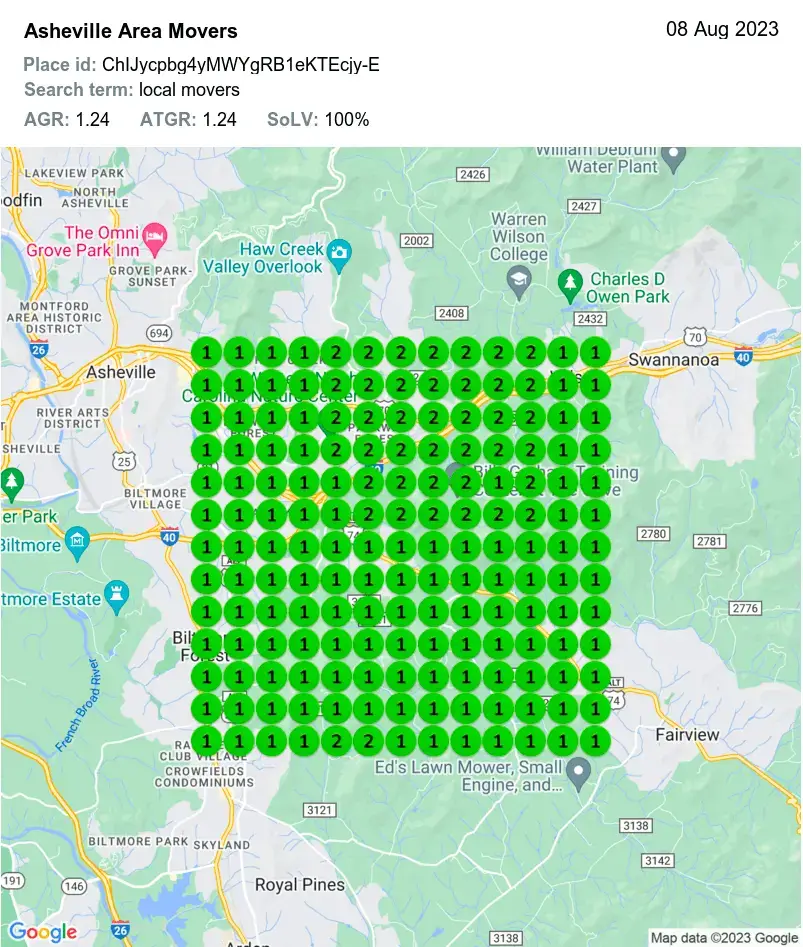 They’re a moving company based in Asheville, NC, who started with us for organic SEO and then maximized their online visibility with Google Maps SEO. They’re ranking in the top positions (1ˢᵗ and 2ⁿᵈ as demonstrated by the cells), dominating a 40-mile radius!