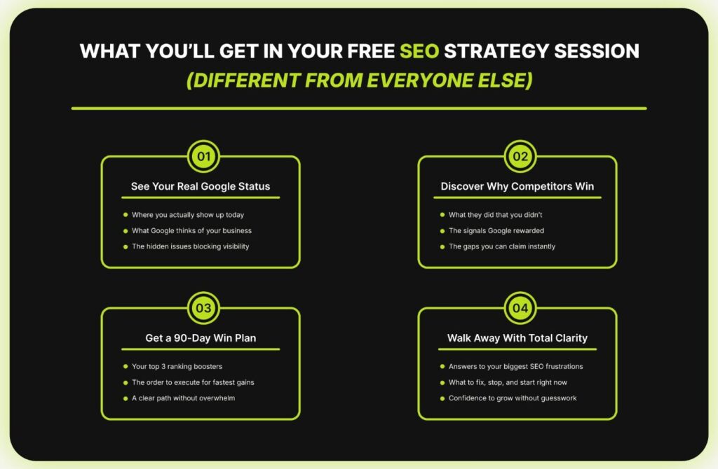 - 90-Day Visibility Guarantee: If rankings don’t improve, we work for free until they do.