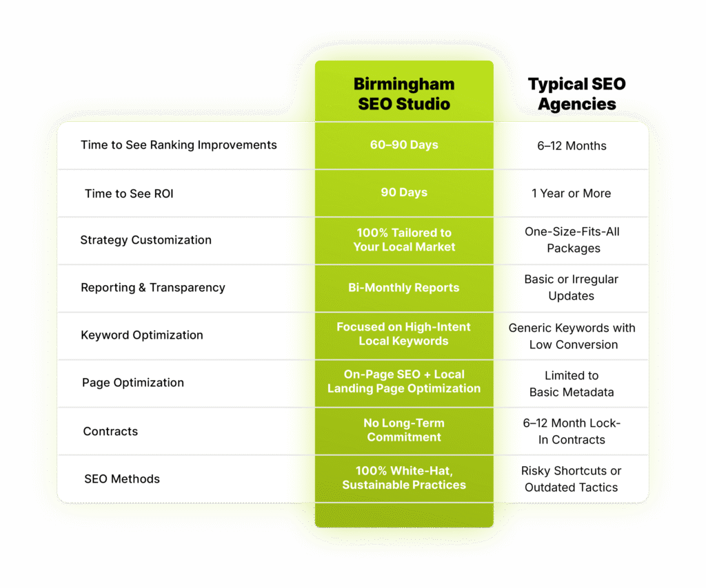 Birmingham SEO Studio is the best Local SEO agency for a reason. With us, there’s NO WAY you won’t get results AND get them 3x faster. This is why we’re the #1 choice for local SEO in Birmingham.